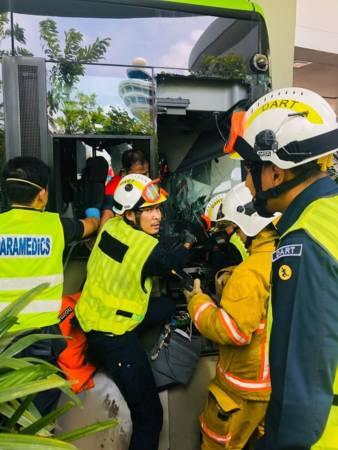 新加坡民防部队昨午发面子书贴文说,他们是在中午12时36分接到通报。民防部队人员抵达现场时,发现巴士车头严重凹陷,导致司机困在车座上。