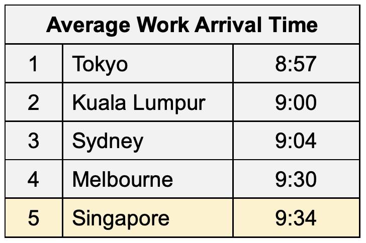 在上班时间排名中,新加坡平均上班时间为上午9:34,名列第五,相对于平均上班时间在上午8:57的东京,让小编觉得还是有一丝感到庆幸,毕竟多睡半小时可是经济半小时呀~