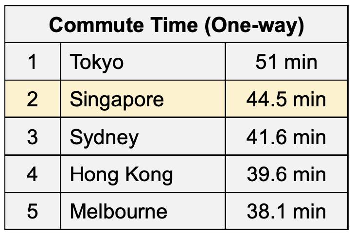 然而在通勤时间上,新加坡以单程耗时44.5分钟排在第二位,想想小编没有搬家之前可是要花一个多小时的单程通勤,现在终于在这个平均水准以下了,不过,房租也高了