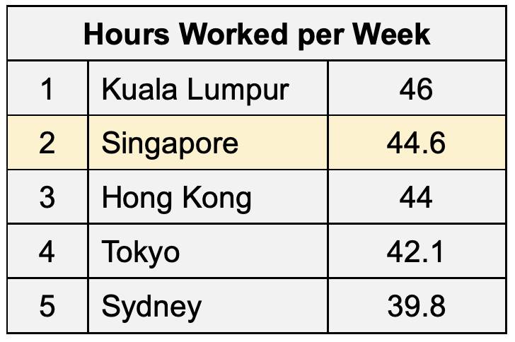 在每周工作时间排名中,新加坡每周工作时间为44.6小时,名列第二,居然比一向哀嚎的东京和香港还高,不过让小编意想不到的是,夺得榜首的是吉隆坡,比新加坡还要多1.4小时,看来马来西亚的朋友们也很拼啊。