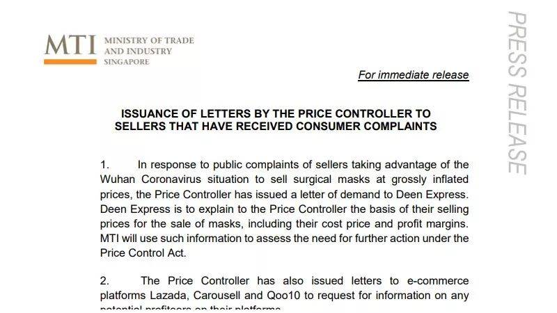 正式监管及监督新加坡的口罩市场价格。