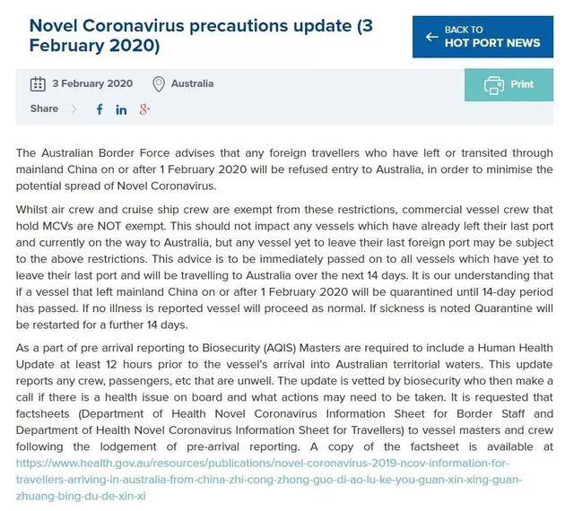 具体为,2月1日前已经驶往澳大利亚的船舶将不受影响,但在2月1日或2月1日后离开中国大陆前往澳大利亚的船舶,将被隔离14天。如果船员未报告有任何疾病,船舶将正常工作。如果有船员报告生病,则船舶将重新被隔离14天。