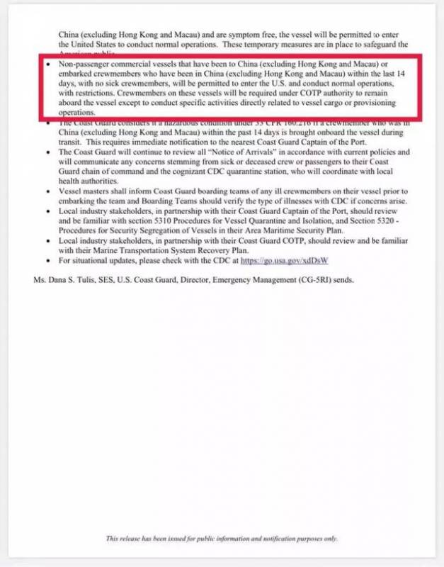 根据航运企业提供的来自美国海岸警卫队的安全通告显示,美国方面要求,14天内到过中国大陆(香港和澳门除外)的船舶和船员,如果船员没有生病,船舶可以靠泊美国港口,但船员必须留在船上,除非需要进行特殊活动。