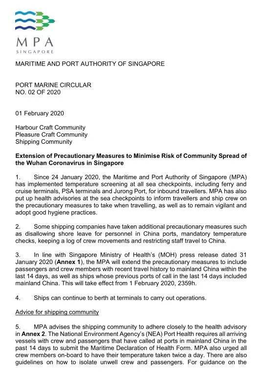 新加坡海事及港口管理局(MPA)2月1日发布通知称,依照新加坡卫生部此前发布的相关规定,MPA将会对过去14天内前往中国大陆的旅客和船员,以及在过去14天内曾在中国大陆停靠过的船舶,实施更加严格的预防措施,增加检疫流程,但不影响船舶靠泊作业。