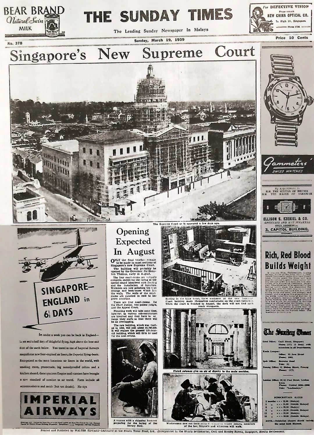 典雅的前高等法院如今为国家美术馆,原建筑从奠基到落成,只花了两年半时间,于1939年完工。海峡时报图文并茂,高度表扬参与建设的三水女工。