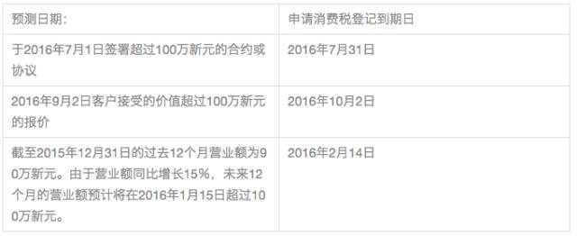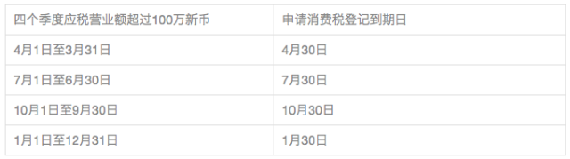 换句话说,您必须在每个季度结束时回顾您过去12个月的应税营业额,并在您的应税营业额12个月累计超过100万新币时注册消费税。如果您确定未来12个月的应税营业额不会超过100万新币,并可以提供相关文件证实,则不需要注册用于消费税。不过,您必须每年3月,6月,9月和12月底继续核实过去12个月的应税营业额。