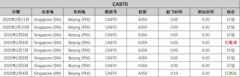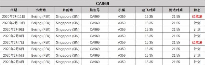 新加坡往返北京的航班每日一班,2月11日后取消。(其中2月7日、11日飞往新加坡,8日飞往北京的航班已取消)