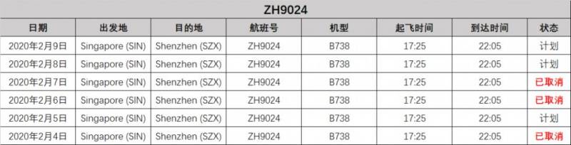 取消2月10日至3月28日的所有航班,仅剩的飞往中国深圳的ZH9024航班2月4日、6日、7日均已取消,其余未知。