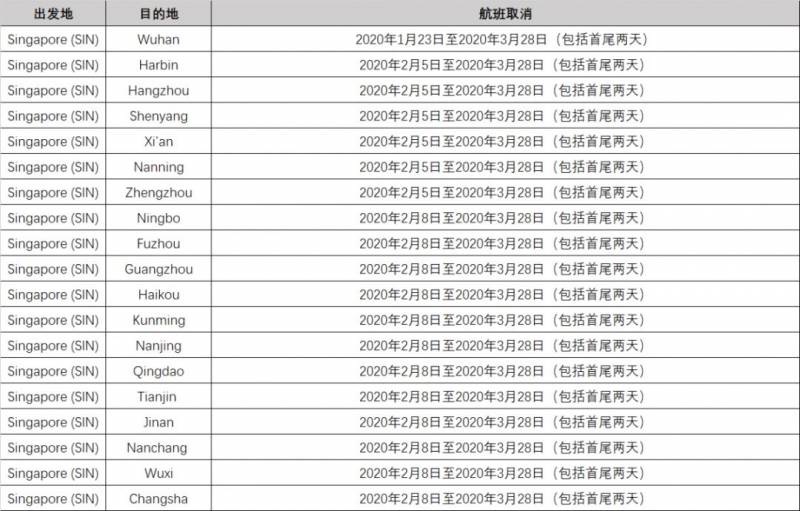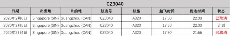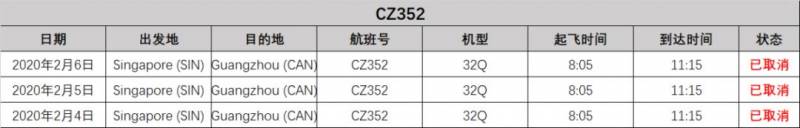 计划取消从2月7日至3月28日飞往新加坡的所有航班,而飞往广州的CZ352,2月7日前的航班都已取消。
