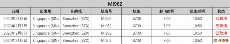 由新加坡至重庆(于深圳中转)的MI962航班,将于2月9日起停飞,而最新的消息是2月5日的航班“取消预警”,2月9日前的其它航班也悉数取消。