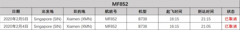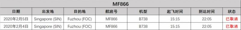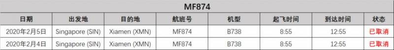 计划取消从2月4日至3月31日的所有航班,M飞往厦门MF874航班、MF852航班,及飞往福州的MF866航班均已取消。