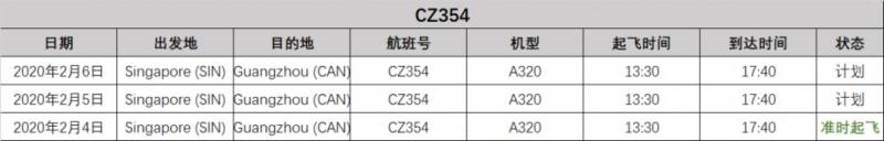 飞往广州的CZ354航班,今日准时起飞,2月5日及6日未知。