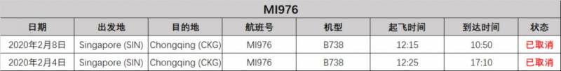 由新加坡至重庆的MI976航班,将于2月11日起停飞,2月9日前的其它航班也均取消。