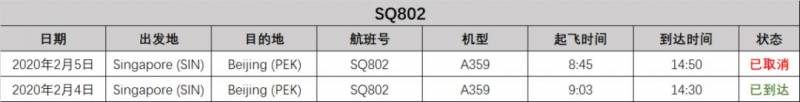 由新加坡至北京的SQ802航班今日正常运营,2月5日起停飞。