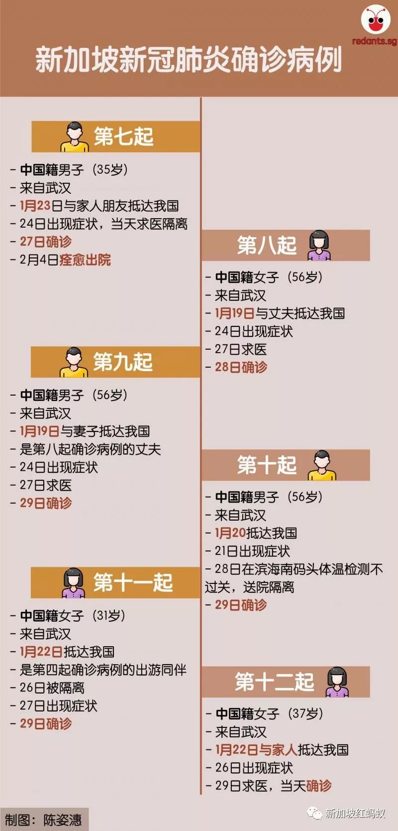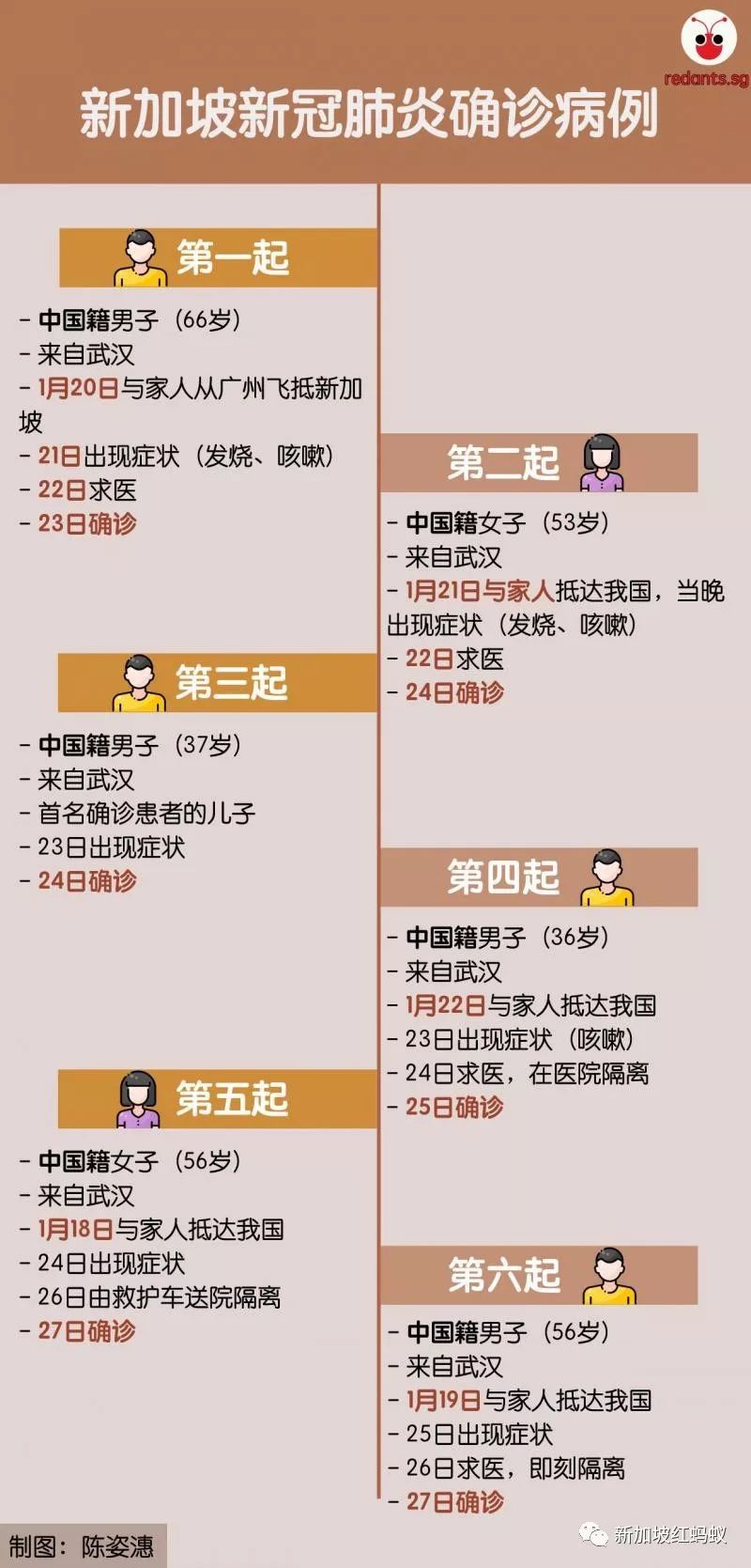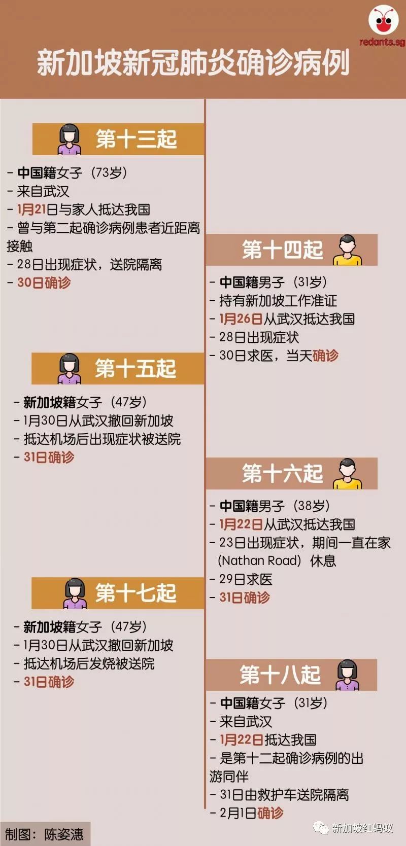 本地网媒《慈母舰》访问了永泰行隔邻的酒店老板,得知每天平均有五辆旅行大巴会带旅客到永泰行购物,不过旅行车上一般不会坐满人。旁边另一家古董店则透露,昨天(3日)下午永泰行的职员曾花几小时来清洗消毒店面。第22例和23例都是乘搭酷航回国的新加坡籍女子。她们在登机前都没有出现症状,抵达新加坡后也没有症状,但立即被强制隔离。本星期一(2月3日)新冠肺炎病毒检测呈阳性,但是依然没有出现任何发病症状。两人目前都在国家传染病中心隔离。红蚂蚁也为蚁粉们整理出新加坡早前18起病例的一览表,方便参考。