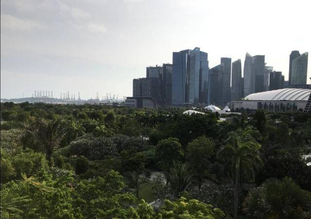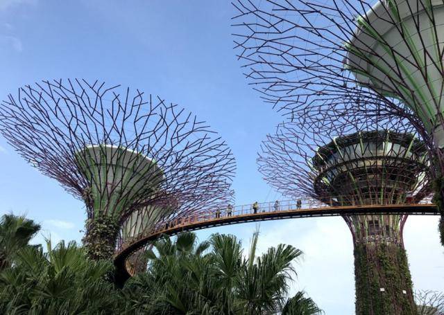 滨海湾花园很大,里面有植物冷室、园艺展览花园等,因为时间关系我们只就近逛了一下,在擎天大树的空中步道玩了一会。空中步道需要收费,价格好像在8新币左右。我们先乘电梯到达距离地面二十几米的擎天大树上部,然后在空中步道上漫步。空中步道为悬索吊装结构,两侧虽有防护网,但步道随着马六甲海峡吹来的海风,微微晃动,给人一种飘飘感。幸亏前一天我们刚接受了多次过山车的洗礼,否则恐高的感觉会让我们寸步难行。漫步在空中步道,滨海湾花园周围的景色尽收眼底,深邃的海水,繁忙的航道,高耸的树木,低矮的灌木,间或冒出各色美丽花朵,近处大大的摩天轮,轮船造型的金沙酒店掩映在充满热带风情的公园里。西边远处金融区耸立著如林的摩天大楼,南边繁忙的港口,一排排高耸入云的吊机正在忙碌的工作,仿佛在向我们描述新加坡的富足和繁荣。