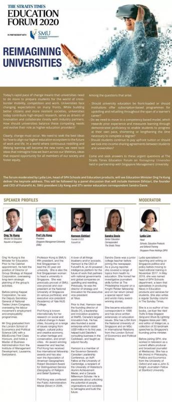由《海峡时报》主办、新加坡管理大学协办的“海峡时报教育论坛2020 – 大学重塑”将于2020年2月15日于新加坡管理大学举行。新加坡教育部长王乙康将是论坛主宾。