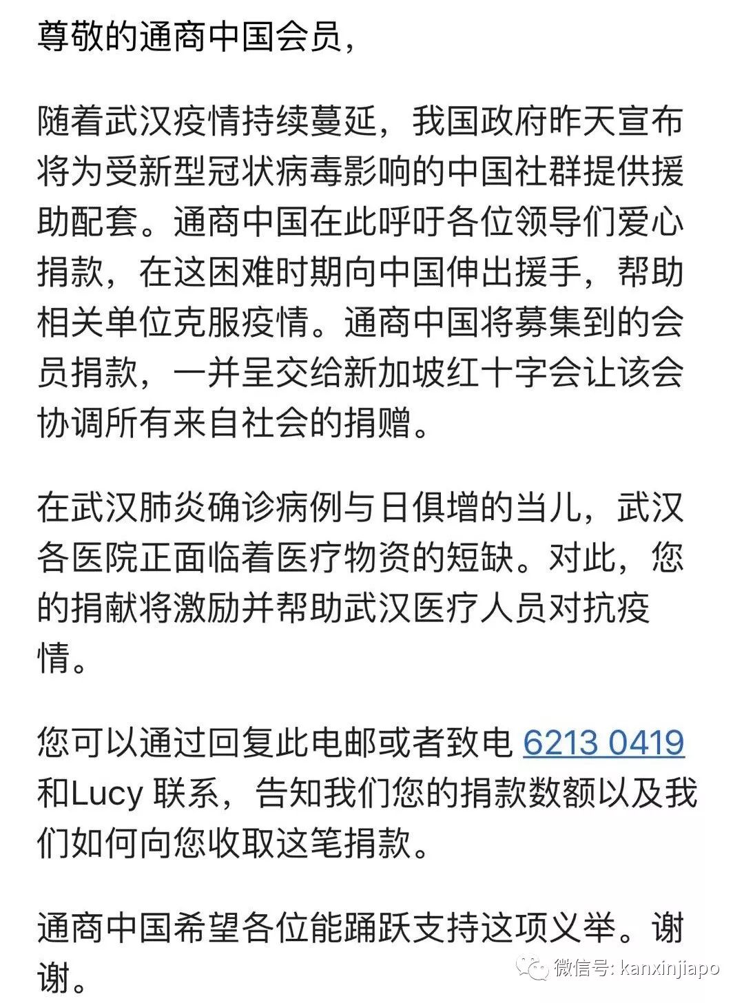 在这里就要给大家科普一下了,国际上发生重大灾难,新加坡的援外救助通常分为以下三个部分。 第一,先由新加坡红十字会带头,比如承诺捐赠5万美元,然后号召人民捐款。捐款专用,人们捐款到红会时,要注明这笔捐款是要捐给某国灾民的。红会在筹款结束之后,将收到的所有款项、物资等捐给受灾国。第二,政府行为,一个是新加坡政府的捐款,同样是捐到新加坡红十字会,将来再由红会转捐出去。政府的这个捐款叫“种子基金”。比如这次的100万新币就是种子基金;还有一个,就是出力。除了上述汶川地震的例子,还有2011年新西兰地震,新加坡派出武装部队以及民防部队赶到新西兰重灾地区基督城。由116名武装部队精卫队队员组成的代号“狮心行动”的救援小组进行地震灾难救援。 第三,新加坡各界主动捐款,比如汶川地震时,新加坡社会各界就捐助了超过2亿人民币的善款。新加坡政府的态度是,援外赈灾,应该由民间主导。政府捐款主要是表态。表的什么态?还是得用新加坡外交部的一句老话——新加坡政府的捐助力度,主要考虑与受助国的关系。 这次新冠病毒肺炎救助捐款,新加坡政府就以史上最高金额的100万新币捐助表了极其明确的态度。 新加坡民间也启动了筹款。 昨天(2月4日),通商中国会员就接到来自秘书处的电邮,呼吁会员为本次疫情进行捐款,本着人道主义帮助中国克服疫情,渡过难关。