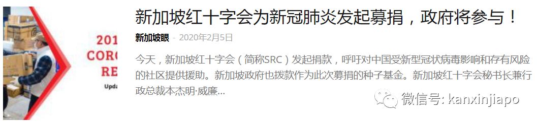 (2月4日),新加坡红十字会(SRC)发动捐款捐物,助华抗击新冠病毒肺炎疫情,新加坡外交部继而宣布,新加坡政府拨款100万新币(约506万人民币)作为种子基金,支持新加坡红十字会的义举。