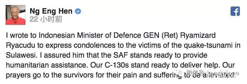 当时,新加坡国防部部长黄永宏也在当时致信印度尼西亚国防部长GEN(Ret)Ryamizard Ryacudu,向苏拉威西岛地震海啸受害者表示哀悼。同时,黄永宏称“我向他保证SAF已做好人道主义救援的准备。我们的C-130已做好运输支援的准备,并祈祷幸存者的痛苦得到缓解”。