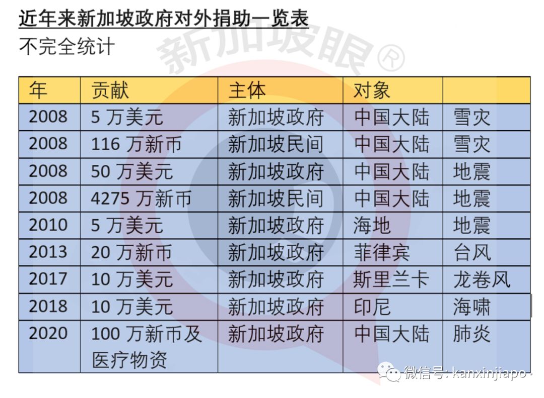 新加坡外交部说:“透过密切合作,我们有信心新加坡、中国以及其他国际社会会共同克服这个挑战。”与惯例相比,新加坡这次的赈助有一同一异。 与以往相同的是,本次赈助仍然由民间为主,即:由新加坡红十字会、本地商协会、工商界及社团主导,发动、领导本地社群捐款捐物。与以往不同的是,这次新加坡政府出资100万新币(约506万人民币),是前所未有的额度。我们看一看新加坡政府过去10年左右对国际上一些灾难的赈助: