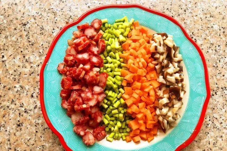 图片来源douguo.com2. 将所有食材切丁备用3. 将米饭,蔬菜和腊肠丁依次铺入电饭煲中,加入煮米饭所需水分