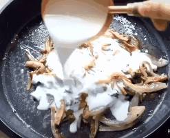 图片来源抖音@海底两百斤4. 热锅下黄油,炒洋葱,加入蘑菇5. 依次加入少量面粉、奶油和没过洋葱的牛奶煮