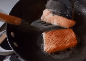 图片来源抖音@吃饭了大小姐4. 锅底倒橄榄油烧热,小火放入三文鱼,每一面煎至变色5. 铺上之前调好的酱料,盖住锅盖煎1分钟