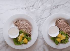 图片来源ifeng.com所需主料三文鱼半边柠檬2片所需调料粗粒芥末酱,蛋黄酱海盐,黑胡椒,橄榄油烹饪步骤:1. 清水冲洗三文鱼,用纸巾蘸干水分,切段2. 三文鱼撒海盐和黑胡椒腌制3. 一勺粗粒芥末酱加一勺蛋黄酱搅匀备用