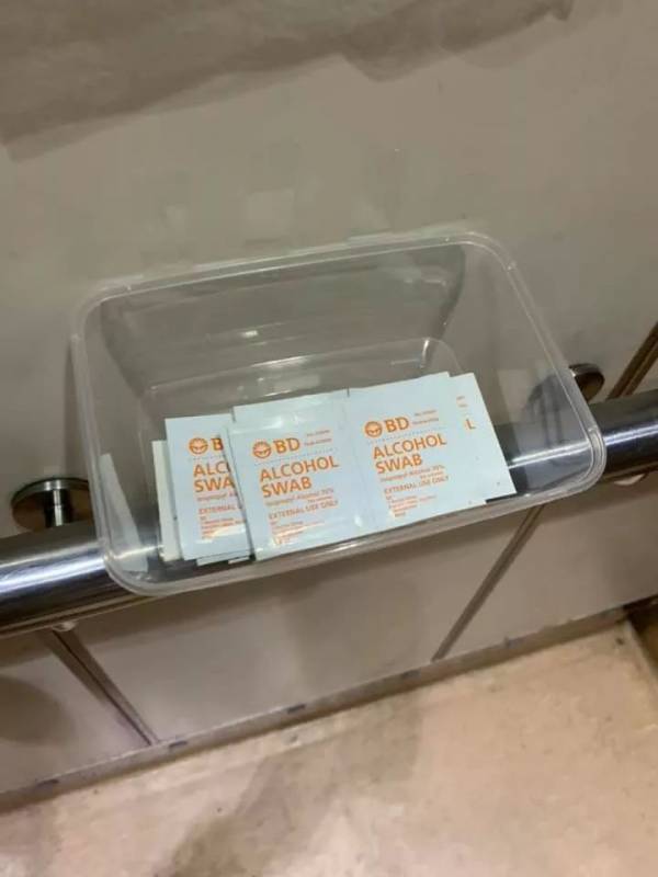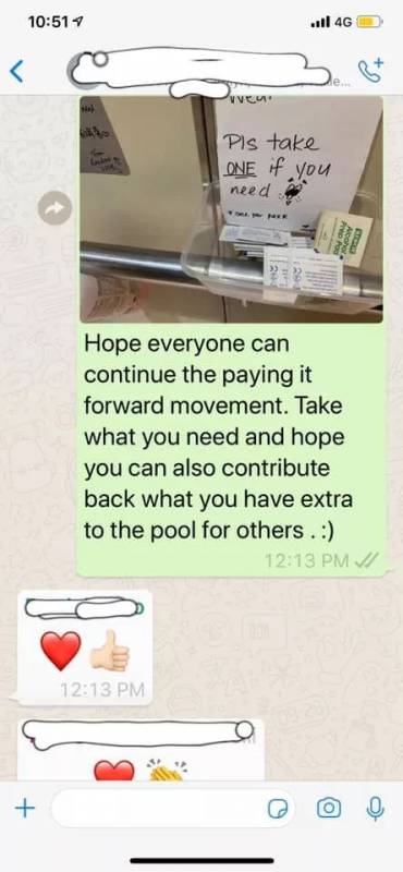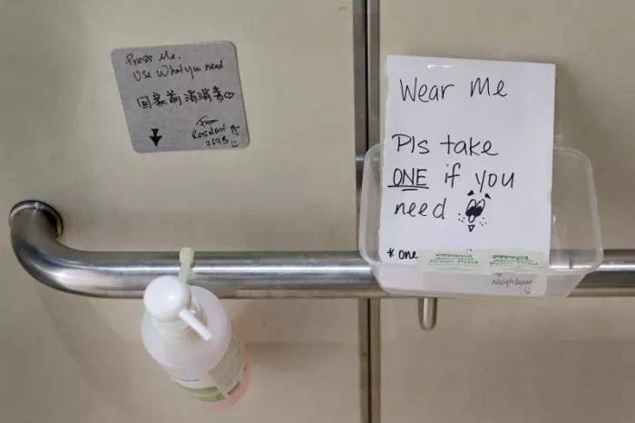 无独有偶,这样的善举并不是在Adrian一个人身上得到体现。在榜鹅267B,有一群居民贡献出自己的消毒酒精片、洗手液、酒精等物品,放在公共区域供需要帮助的人使用。