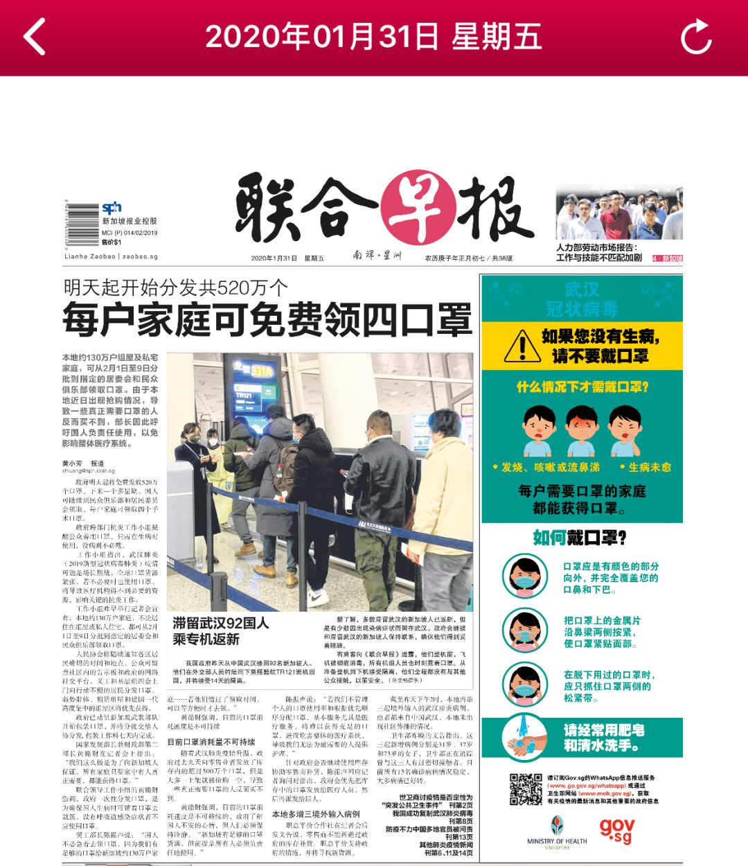 虽有防疫专家提醒,口罩是预防新型冠状病毒感染的“利器”,但从1月31日起,新加坡主流媒体《联合早报》每天都在头版的醒目位置提醒国民:如果您没有生病,请不要戴口罩。