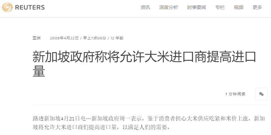 常存忧患意识的新加坡一向懂得居安思危。这是一则12年前的旧闻----2008年4月,鉴于消费者担心大米供应吃紧和米价上涨,新加坡将允许大米进口商们提高进口量。