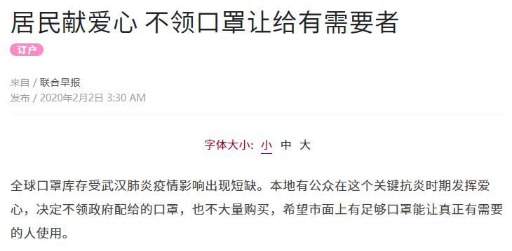 的确,全岛大规模分发口罩以来,有人自愿不领口罩,希望让稀缺资源能够更合理被运用。