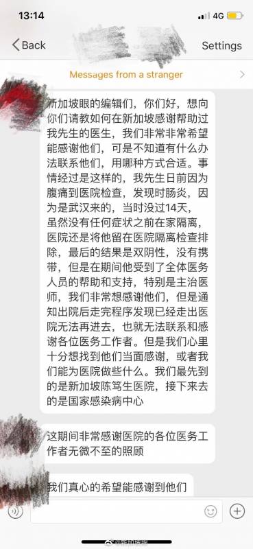 武汉网友在新加坡进行隔离期间患上了肠炎。“祸不单行”的他受到陈笃生医院医护人员悉心照顾。由于无法联系到当时诊疗的人员,网友希望通过新加坡眼表达感激之情。