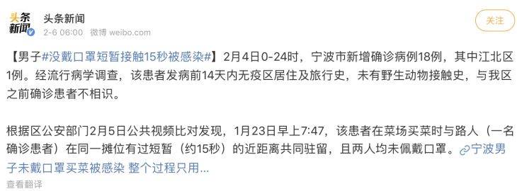 与此同时,6日早上,一条#出门买菜未带口罩被感染#的话题登上微博热搜。