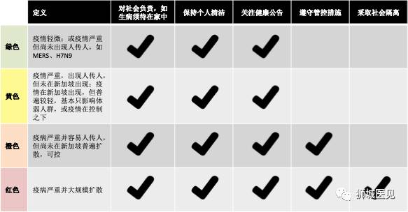 Disease Outbreak Response System Condition (DORSCON) 新加坡疫情应对系统框架。根据疫情轻重程度,通过绿、黄、橙、红四个颜色统一协调全国各界应采取的防治措施。