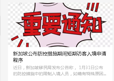 近日,新加坡移民局发布公告称, 1月31日公布的防控措施中的限制入境人员,如确有特殊原因需到访新加坡的,可向移民局提出入境申请。有关申请程序和材料详情见以下网址: