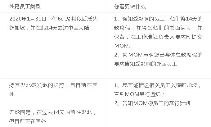 1、所有这些员工抵达新加坡后将被隔离。MOM强烈建议雇主要求这些员工推迟来新加坡,直到另行通知。