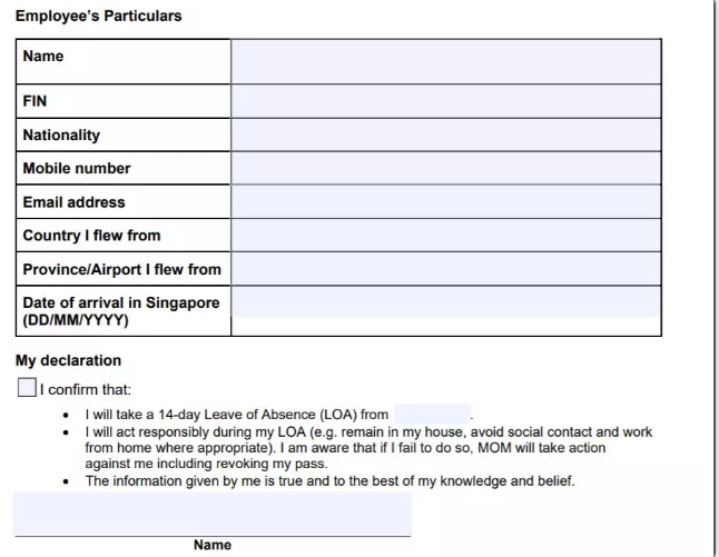 3、需要填写缺席假反馈表格(Leave of Absence acknowledgement form)并且在入境新加坡三天之内回复人力部邮件,发送表格至邮箱:
