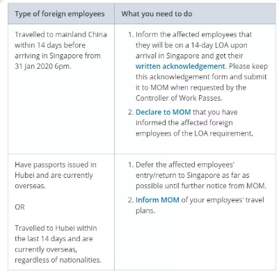 新加坡人力部(MOM)2月5日发布通告,并发邮件给在新加坡的公司,通知在1月31日及之后回到新加坡,并且在此之前14天内到访过中国的准证持有人,除了拿缺席假(LOA)进行隔离而且还必须填写缺席假反馈表发送给人力资源部,否则会影响后期准证的存续。