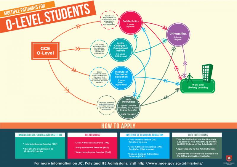 凭借O水准成绩,通常考生可以选择进入初级学院(Junior College,简称JC)、政府理工学院(Polytechnics)、大学预备班(Pre-University)、工艺教育学院(ITE)、政府资助的艺术院校项目(目前有LASALLE和NAFA)。通常来讲,在新加坡本地升学与工作前景更为理想的是私立学院和政府理工学院。我们会重点讲解这两种升学途径。英联邦国家如英国、澳大利亚、新西兰等地都承认O水准成绩,可以用成绩去这些国家读大学预科。