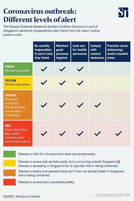 DORSCON是新加坡疾病爆发应对系统的缩写,分为四个级别:绿色、黄色、橙色、红色。