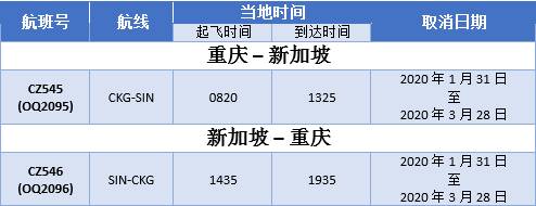 1月31日至3月28日取消新加坡往返重庆航班(重庆航空执飞)。