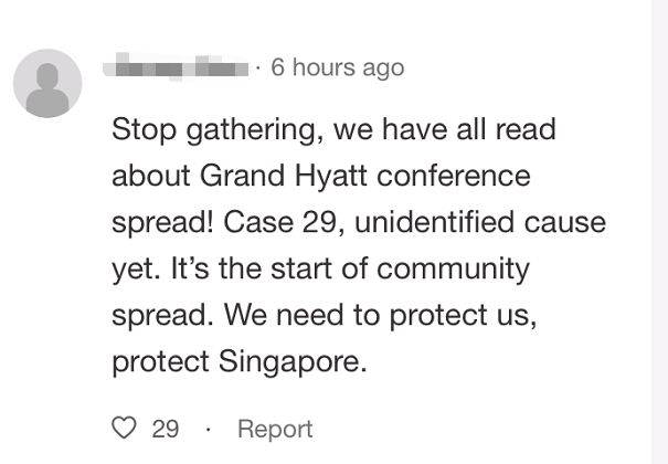 “不要聚会,我们应该看看君悦酒店会议是怎样传播的!病例29还没有明确的感染原因。这是社区传播的开始,我们必须保护自己,保护新加坡。”