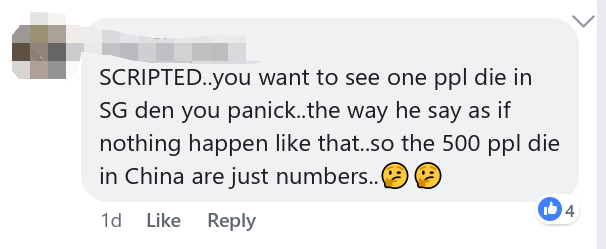 “你想看到一个在新加坡的死亡案例吗? 他说话的口气就好像什么事都没有发生过一样。所以中国的500人死只是数字?”