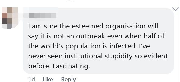 “我相信这个受人尊敬的组织会说,即使世界上一半的人口感染了病,它也不是一场疫情。我从未见过如此明显在制度上的愚蠢。精彩。”