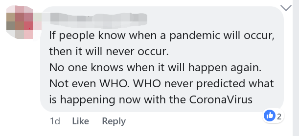 “如果人们知道这大型感染病何时发生,那么它就永远不会发生。没有人知道它何时会再次发生,即使是世界卫生组织。就像谁也不会预料到现在冠状病毒即将发生什么。”
