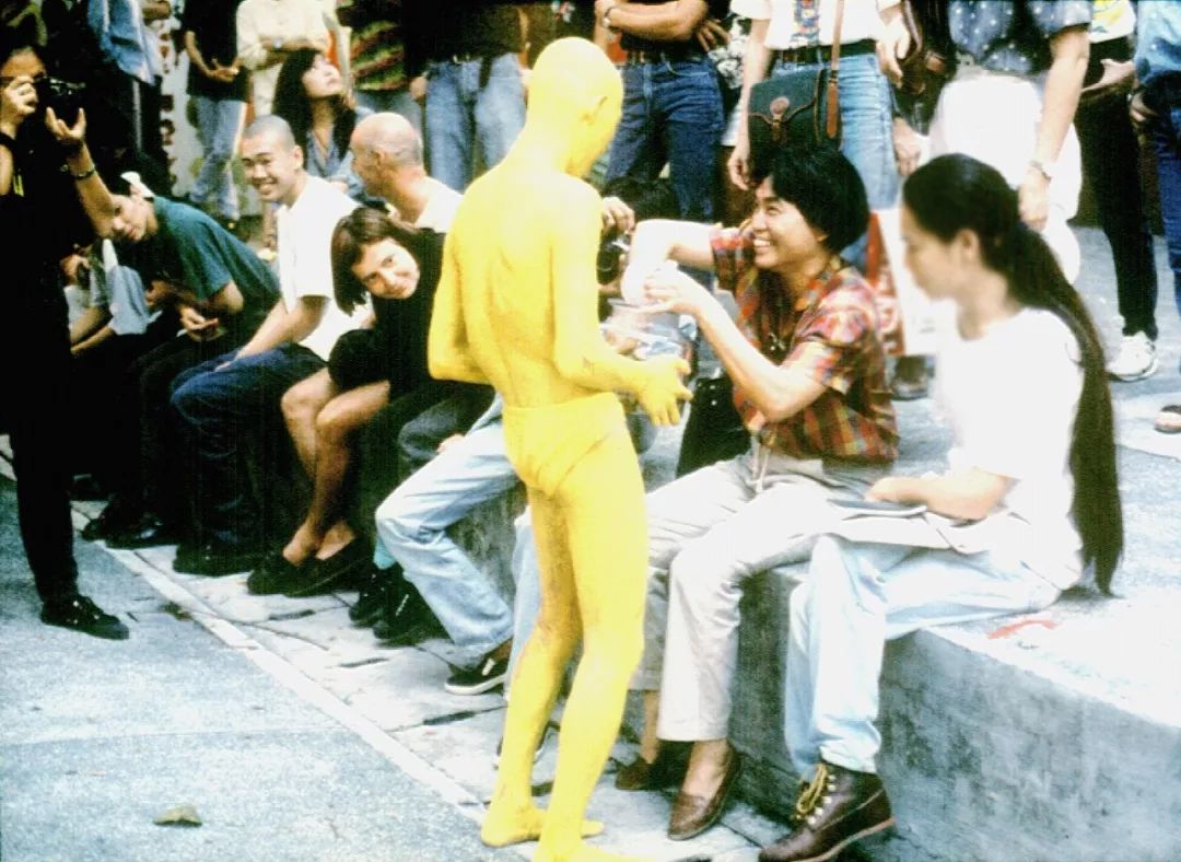 李文的行为艺术《黄人之旅》与庄心珍(坐着穿方格子上衣者)(许元豪摄)