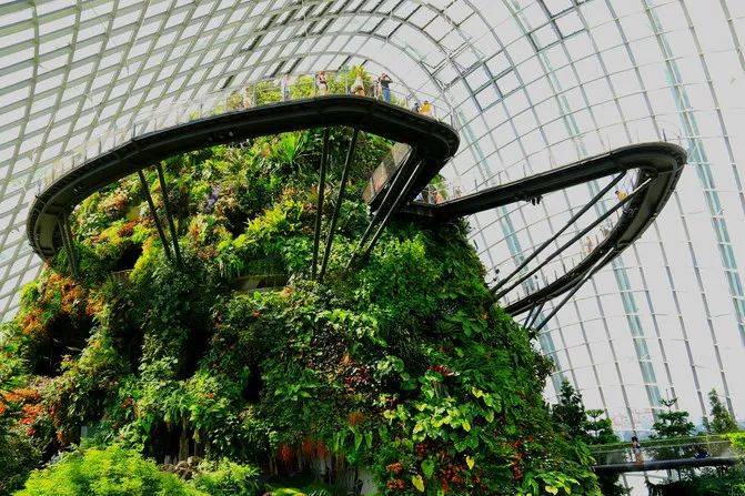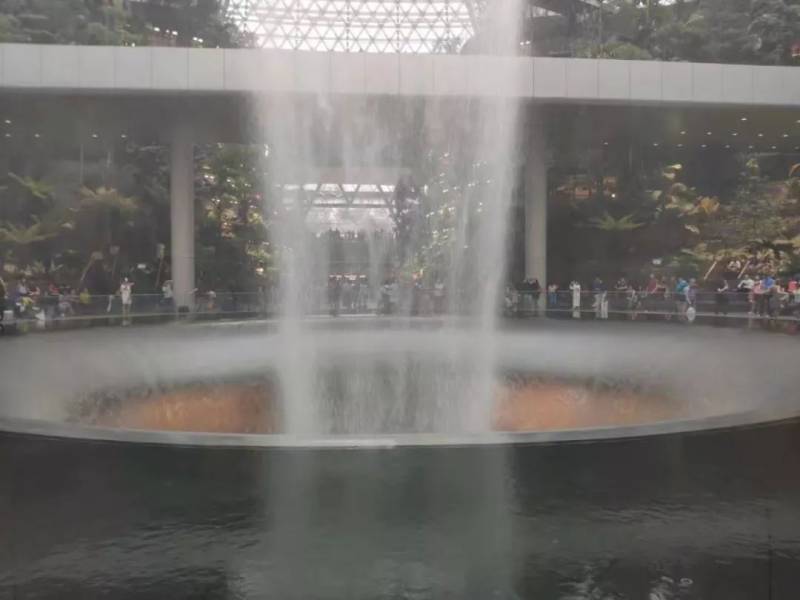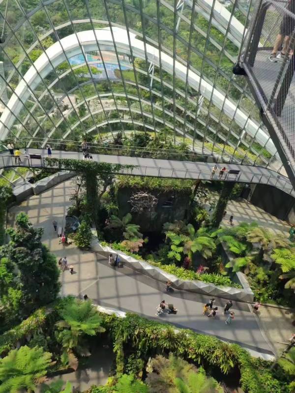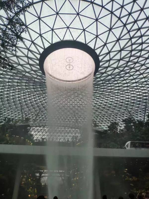 从天而降的瀑布贯穿整个购物中心,火车从中间穿过,树林绿化,美食,应有尽有