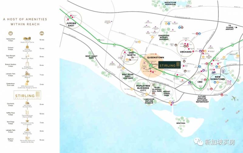 再来说说尚景苑Stirling Residences的位置条件,步行500米(约6分钟)即可抵达地铁东西线女皇镇站。5站地铁内,向西可抵达裕廊东,这里是新加坡打造的第二个CBD,向东则可以抵达莱佛士坊金融商业区,地理位置非常优越。